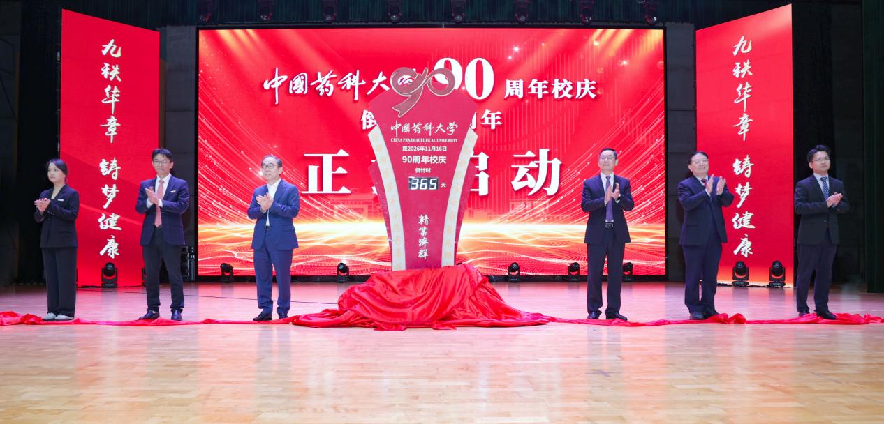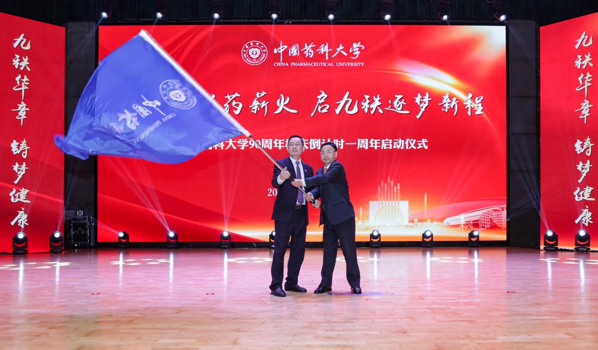 學校依次發(fā)布了《中國藥科大學90周年校慶公告(第一號)》《“興藥強國 鑄夢健康”的中國藥大人共識》,揭曉了90周年校慶主題、標識及學校吉祥物。儀式上,王廣基、孫飄揚、戴建君、郝海平,以及國家海外優(yōu)青王宗強教授,中國大學生自強之星、2022級本科生朱承玲共同為“90周年校慶倒計時牌”揭牌。隨后,戴建君與湖北校友會副會長錢志強共同啟動了全球校友校旗傳遞儀式。