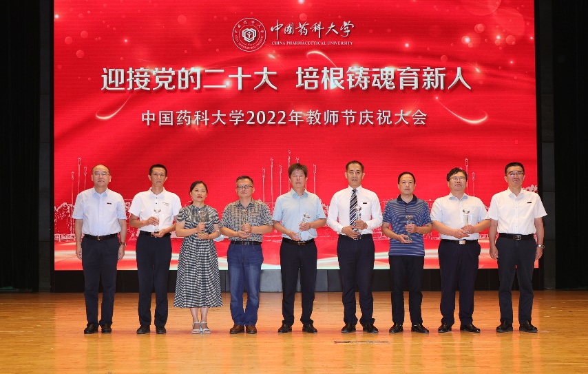 校黨委書記金能明、校長來茂德為我校2021年10月至2022年9月以來退休的教職工代表和2022年度從事教育工作三十年的教職工代表頒發紀念章,感謝他們數十年如一日的默默耕耘。青年教師代表向退休教職工代表獻花,展現了藥大教師隊伍薪火相傳、蓬勃向上的精神風貌。