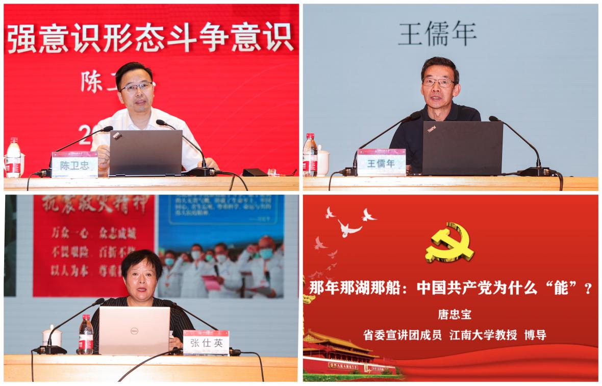 9月17日,校黨委書記金能明以《樹牢“兩個確立”、增強“四個自信”,迎接黨的二十大勝利召開》為題作開班專題培訓。培訓期間,省委宣講團成員、江南大學馬克思主義學院教授唐忠寶,校黨委常委、宣傳部部長陳衛忠,馬克思主義學院黨委書記、院長王儒年,藥學院黨委書記張仕英分別作“那年那湖那船:中國共產黨為什么‘能’?”“堅定理想信念,增強意識形態斗爭意識”“鞏固偉大成果,實現中國式現代化”“弘揚精神譜系,傳承紅色基因”等主題的黨課。課程生動深刻、精彩紛呈。24位班主任老師帶領學員們圍繞“弘揚建黨精神,傳承紅色基因”“知黨愛黨信黨,共話百年輝煌”“堅定理想信念,矢志成才報國”“喜迎二十大,共贏新時代”等主題分4次開展研討交流。