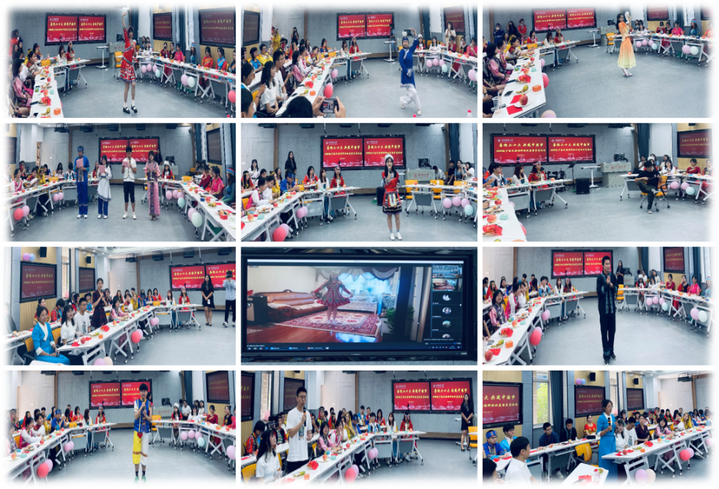 “啊,祖國你就是這樣偉大,你用乳汁養育了千千萬萬英雄的兒女,你用汗水澆灌了這富饒的土地 你用勤勞培養了我們堅定的信念” 來自甘肅的滿族同學金玫玲等以詩歌朗誦的方式慶祝新中國成立73周年;“黨旗隨風飛,今天我們站起來了,喝水不忘挖井人,愛黨愛國愛人民,我愛我的祖國,因為她有五千年歷史,是祖國養育了我……”,來自湖南的苗族同學龍夢琪以自創苗族歌曲為新中國慶生;來自新疆的維吾爾族同學祖麗米熱也連線現場,以舞蹈表演的方式表達祝福。活動中節目精彩紛呈,節日氛圍濃郁熱烈。來自大江南北的各族學子通過演奏、歌唱、跳舞串燒、詩朗誦等方式,共同祝福新中國繁榮昌盛、各族人民幸福安康。活動期間,同學們圍繞學習生活、在藥大的成長、家鄉變化、未來發展規劃等方面進行了交流分享。