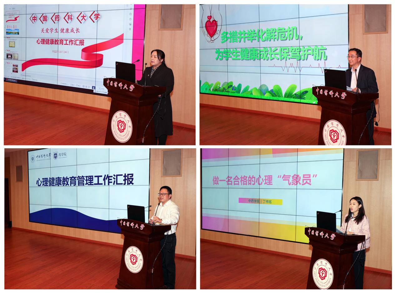 會上,學校心理發展中心主任高艷玲、學工處處長杜文清分別以《關愛學生,健康成長》《多措并舉化解危機,為學生健康成長保駕護航》為題,介紹了學校心理健康教育工作開展情況,對工作中存在的問題、難點以及未來工作方向作簡要匯報;藥學院黨委副書記孟祥康、中藥學院心理輔導員丁祎銘分別以《心理健康教育管理》《做一名合格的心理“氣象員”》為題作經驗分享,并提出了意見和建議。馬克思主義學院院長王儒年、教務處處長唐偉方、研究生院常務副院長丁錦希、體育部主任紀乃旺、校團委書記張楊彬分別結合本部門工作作主題發言。